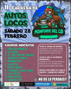 El Ayuntamiento de Monforte del Cid da a conocer la programación oficial de la II Carrera de Autos Locos, que se celebrará el próximo sábado 28 de febrero y que contará con la participación de 11 equipos, cifra que consolida el crecimiento y la buena acogida de esta iniciativa.