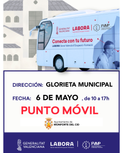 Gracias a un convenio entre el Ayuntamiento de Monforte del Cid, Labora y la Federación Valenciana de Municipios y Provincias (FVMP), el bus oficina de Labora estará en la Glorieta Municipal el próximo martes 6 de mayo. Este servicio itinerante, que ya ha visitado el municipio en ocasiones anteriores, atenderá a la ciudadanía de 10:00 a 17:00 horas, sin necesidad de solicitar cita previa.
