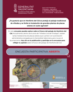 Tal y como ya informó el Ayuntamiento de Monforte del Cid, la Generalitat Valenciana ha abierto una encuesta de participación ciudadana en la fase inicial del Plan de Acción Territorial (PAT) del Paisaje Cultural del Vino de Alicante.