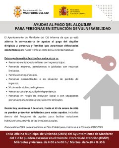 El Ayuntamiento de Monforte del Cid informa de la apertura del plazo para solicitar ayudas al pago del alquiler dirigidas a personas y familias en situación de vulnerabilidad del municipio.