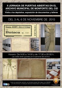 –Jornadas de puertas abiertas y visitas programadas: Con motivo de la celebración del 9 de junio, Día Internacional de los Archivos, desde hace unos años hemos celebrado unas Jornadas de puertas abiertas en las dependencias del archivo histórico municipal. A través de distintos aspectos característicos del archivo, realizamos una exposición guiada en la sala de investigadores. Mostramos la organización del archivo, el depósito, los soportes y documentos restaurados, así como los medios de difusión del patrimonio documental: las exposiciones, los libros y artículos de investigación histórica entre otros. También acercamos la historia de Monforte del Cid a través de una pequeña muestra de documentos que reflejaban acontecimientos históricos conocidos por todos los monfortinos. Por último, presentamos las donaciones y cesiones realizadas por vecinos del pueblo que han enriquecido enormemente los fondos del archivo.