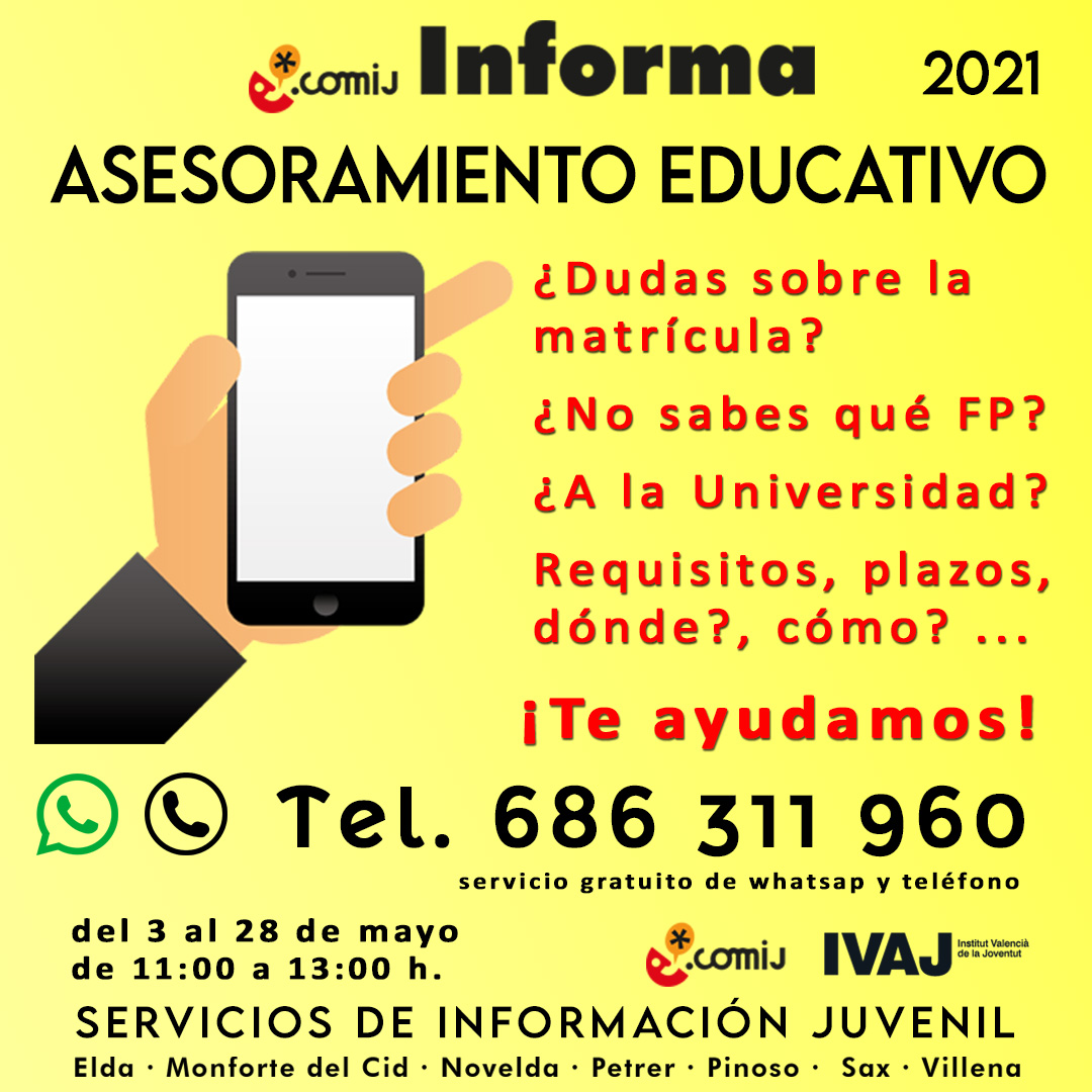 Nuevamente desde las poblaciones que integran COMIJ, Coordinadora que incluye los servicios de información juvenil de las comarcas del Alto y Medio Vinalopó, de la que forma parte el Área de Juventud del Ayuntamiento de Monforte del Cid, se organiza el servicio de atención especializada e individualizada a la población juvenil y adolescente que desea obtener información sobre procedimientos de acceso a formación.