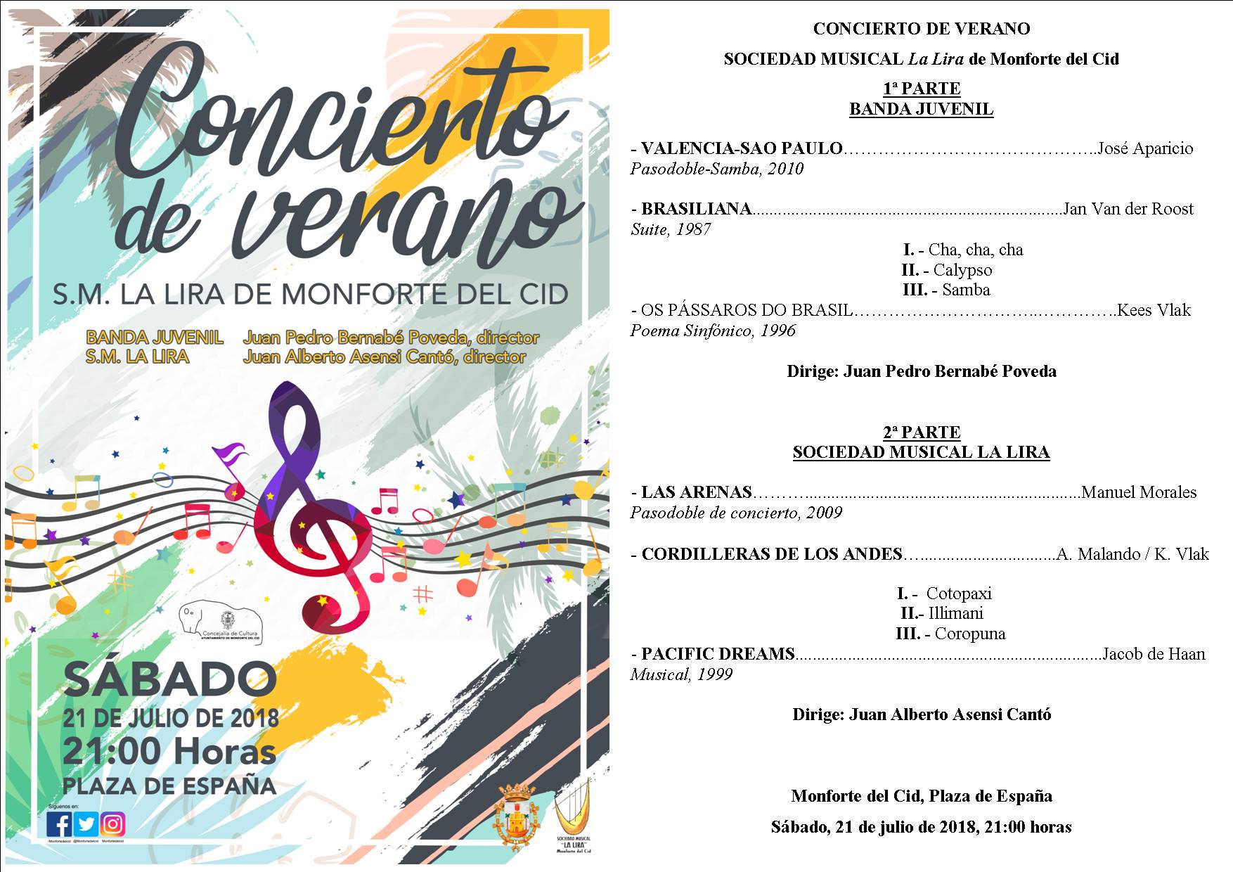 El sábado 21 de julio, a las 21:00 h., se celebrará en la plaza del Ayuntamiento el Concierto de Verano de la S. M. La Lira. Constará de dos partes, siendo la primera ofrecida por la Banda Juvenil y las segunda por la S. M. La Lira.
