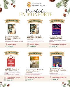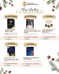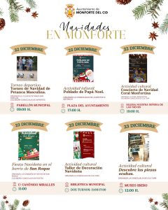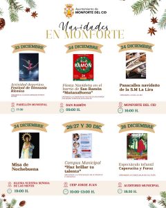 El Ayuntamiento invita a todos los vecinos y visitantes a participar en esta programación navideña, que combina tradición, cultura, deporte y diversión, creando un ambiente festivo y acogedor para celebrar estas fechas tan especiales en Monforte del Cid.