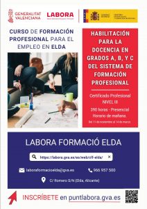 Curso de Formación LABORA “HABILITACIÓN PARA LA DOCENCIA EN GRADOS A, B y C del SISTEMA DE FORMACIÓN PROFESIONAL” CARTEL CURSO – DocenciaTRIPTICO, que se iniciará el día 11/11/2024 en el centro Labora Formación de Elda. Se trata de un curso de 390 horas, que se prolongará hasta marzo de 2025. El curso es completamente gratuito, está dirigido preferentemente para desempleados, y se imparte directamente por LABORA en su centro de formación de Elda, en horario de mañana, de 9 a 14 horas, de lunes a viernes. La acción formativa proporciona el título que permite impartir como docente de Formación Profesional en los grados A, B y C (certificados profesionales), tanto en centros públicos como en entidades privadas que organicen cursos oficiales. Los interesados en inscribirse para la selección de alumnos que se realizará el día 06/11/2024, pueden hacerlo en la página de PUNT LABORA.