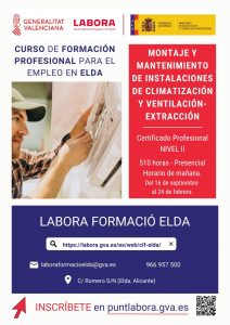 Curso de Formación LABORA «MONTAJE Y MANTENIMIENTO DE INSTALACIONES DE CLIMATIZACIÓN Y VENTILACIÓN-EXTRACCIÓN» TRANSMISIONES VEHÍCULOS (1) Tríptico, que se iniciará el día 16/09/2024 en el centro Labora Formación de Elda. Se trata de un curso de 510 horas, que se prolongará hasta febrero de 2025. El curso es completamente gratuito, está dirigido preferentemente para desempleados, y se imparte directamente por LABORA en su centro de formación de Elda, en horario de mañana, de 9 a 14 horas, de lunes a viernes. La acción es un Certificado Profesional, que habilita para la manipulación de gases fluorados. Los interesados en inscribirse para la selección de alumnos que se realizará el día 06/11/2024, pueden hacerlo en la página de PUNT LABORA.