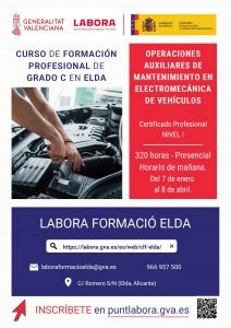 Curso de formación LABORA “OPERACIONES AUXILIARES DE MANTENIMIENTO EN ELECTROMECÁNICA DE VEHÍCULOS” CARTEL – Electromecánica, que se iniciará el día 07/01/2025 en el centro LABORA Formació de Elda. Se trata de un curso de Formación Profesional GRADO C, CERTIFICADO PROFESIONAL NIVEL I, de 320 horas, que se prolongará hasta el 7 de abril de 2025. El curso es completamente gratuito, está dirigido preferentemente para desempleados, y se imparte directamente por LABORA en su centro de formación de Elda, en horario de mañana, de 9 a 14 horas, de lunes a viernes. La acción formativa proporciona el conocimiento de una amplia gama de competencias profesionales, con muchas posibilidades de inserción laboral. Los interesados en inscribirse para la selección de alumnos que se realizará el día 26/12/2024, pueden hacerlo en la página de PUNT LABORA en el apartado “Formación”: https://puntlabora.gva.es/puntlabora/?lang=es