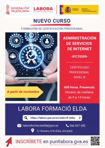 Curso de formación LABORA “ADMINISTRACIÓN DE SERVICIOS DE INTERNET” Cartel 2024, que se iniciará el día 11/11/2024 en el centro LABORA Formación de Elda. Se trata de un curso de 620 horas, que se prolongará hasta el 28 de mayo de 2025. El curso es completamente gratuito, está dirigido preferentemente para desempleados, y se imparte directamente por LABORA en su centro de formación de Elda, en horario de mañana, de 9 a 14 horas, de lunes a viernes. Esta acción formativa oficial es un Certificado Profesional de nivel III. Los interesados en inscribirse para la selección de alumnos, que se realizará a partir del día 04/11/2024, pueden hacerlo en la página de PUNT LABORA en el apartado “Formación”: https://puntlabora.gva.es/ofsrvfor/consultar/busqueda