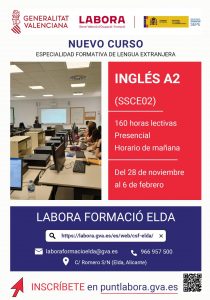 Curso de formación LABORA “INGLÉS A2″ CARTEL ingles A2, que se iniciará el día 28/11/2024 en el Centro LABORA Formació de Elda. Se trata de un curso de 160 horas, que se prolongará hasta el 6 de febrero. El curso es completamente gratuito, está dirigido preferentemente para desempleados, y se imparte directamente por LABORA en su centro de formación de Elda, en horario de mañana, de 9,30 a 13,30 horas, de lunes a viernes. Por su duración e intensidad, la acción formativa proporciona las competencias propias del nivel A2 de la lengua inglesa. Los interesados en inscribirse para la selección de alumnos que se realizará el día 26/11/2024, pueden hacerlo en la página de PUNT LABORA en el apartado “Formación”: Cursos – Puntlabora – Puntlabora (gva.es)
