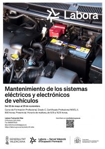 Curso de formación LABORA MANTENIMIENTO DE SISTEMAS ELÉCTRICOS Y ELECTRÓNICOS DE VEHÍCULOS, cuyo inicio está previsto el día 22/05/2025 en el centro Labora Formación de Elda. Se trata de un curso de CERTIFICADO DE PROFESIONALIDAD DE NIVEL II, de 550 horas, que se prolongará hasta el mes de noviembre. El curso es completamente gratuito, está dirigido preferentemente para desempleados, y se imparte directamente por LABORA en su centro de formación de Elda, en horario de mañana, de 9 a 14 horas, de lunes a viernes. La acción formativa proporciona el conocimiento de una amplia gama de competencias profesionales, con buenas posibilidades de inserción laboral. Los interesados en inscribirse para la selección de alumnos, que se realizará a partir del día 16/05/2025, pueden hacerlo en la página de PUNT LABORA en el apartado “Formación”: https://puntlabora.gva.es/puntlabora/?lang=es Más información en: CLF Elda – Generalitat Valenciana