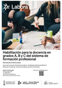 Curso de formación LABORA HABILITACIÓN PARA LA DOCENCIA EN GRADOS A, B y C del SISTEMA DE FORMACIÓN PROFESIONAL, que se iniciará el día 09/06/2025 en el centro LABORA Formació de Elda. Se trata de un curso de 410 horas, que se prolongará hasta octubre. El curso es completamente gratuito, está dirigido preferentemente para desempleados, y se imparte directamente por LABORA en su centro de formación de Elda, en horario de mañana, de 9,15 a 14,15 horas, de lunes a viernes. La acción formativa proporciona el título que permite impartir como docente de Formación Profesional en los grados A, B y C (certificados profesionales), tanto en centros públicos como en entidades privadas que organicen cursos oficiales. Los interesados en inscribirse para la selección de alumnos que se realizará el día 04/06/2025, pueden hacerlo en la página de PUNT LABORA en el apartado “Formación”: https://puntlabora.gva.es/puntlabora/?lang=es Más información en: CLF Elda – Generalitat Valenciana