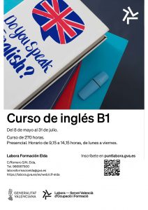 Curso de Formación LABORA INGLÉS B1, cuyo inicio está previsto para el día 08/05/2025 en el centro Labora Formació de Elda. Se trata de un curso presencial de 270 horas, que se prolongará hasta el 31 de julio. El curso es completamente gratuito, está dirigido preferentemente para desempleados, y se imparte directamente por LABORA en su centro de formación de Elda, en horario de mañana, de 9,15 a 14,15 horas, de lunes a viernes. Por su duración e intensidad, la acción formativa proporciona las competencias propias del nivel B1 de la lengua inglesa. Los interesados en inscribirse para la selección de alumnos que se realizará el día 05/05/2025, pueden hacerlo en la página de PUNT LABORA en el apartado “Formación”: Cursos – Puntlabora – Puntlabora (gva.es) Más información: CLF Elda – Generalitat Valenciana