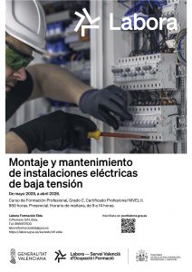 Curso de formación LABORA “MONTAJE Y MANTENIMIENTO DE INSTALACIONES ELÉCTRICAS DE BAJA TENSIÓN”, cuyo inicio se prevé el día 15/05/20254 en el centro Labora Formación de Elda. Se trata de un curso de 950 horas, que se prolongará hasta abril de 2026. El curso es completamente gratuito, está dirigido preferentemente para desempleados, y se imparte directamente por LABORA en su centro de formación de Elda, en horario de mañana, de 9 a 14 horas, de lunes a viernes. La acción formativa proporciona el conocimiento de una amplia gama de competencias profesionales y, una vez finalizado, se obtiene la calificación de Instalador autorizado en todas sus especialidades (Certificado de cualificación individual en baja tensión. Los interesados en inscribirse para la selección de alumnos que se realizará a partir del 07/05/2025, pueden hacerlo en la página de PUNT LABORA en el apartado “Formación”: https://puntlabora.gva.es/puntlabora/?lang=es Más información en: CLF Elda – Generalitat Valenciana