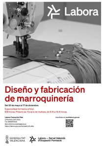 Curso de Formación LABORA “DISEÑO Y FABRICACIÓN DE MARROQUINERÍA”, cuyo inicio está previsto el día 20/05/2025 en el centro LABORA Formació de Elda. Se trata de un curso de 630 horas, que se prolongará hasta el 17 de diciembre de 2025. El curso es completamente gratuito, está dirigido preferentemente para desempleados, y se imparte directamente por LABORA en su centro de formación de Elda, en horario de mañana, de 9 a 14 horas, de lunes a viernes. Esta acción formativa oficial es una especialidad homologada por el SEPE (Servicio estatal público de empleo) y proporciona conocimientos sobre diseño, patronaje, corte, aparado y acabado de productos de marroquinería. Los interesados en inscribirse para la selección de alumnos, que se realizará el día 14/05/2025, pueden hacerlo en la página de PUNT LABORA en el apartado “Formación”: https://puntlabora.gva.es/ofsrvfor/consultar/busqueda Más información en: CLF Elda – Generalitat Valenciana