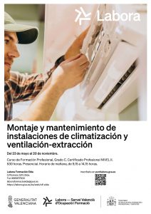 Curso de formación LABORA «MONTAJE Y MANTENIMIENTO DE INSTALACIONES DE CLIMATIZACIÓN Y VENTILACIÓN-EXTRACCIÓN», cuyo inicio se prevé a partir del día 23/05/2025 en el centro Labora Formación de Elda. Se trata de un curso de 530 horas, que se prolongará hasta noviembre de 2025. El curso es completamente gratuito, está dirigido preferentemente para desempleados, y se imparte directamente por LABORA en su centro de formación de Elda, en horario de mañana, de 9 a 14 horas, de lunes a viernes. La acción es un Certificado Profesional de nivel 2, y habilita para la manipulación de gases fluorados. Los interesados en inscribirse para la selección de alumnos que se realizará a partir del día 16/05/2025, pueden hacerlo en la página de PUNT LABORA: Formació – Puntlabora Más información en: CLF Elda – Generalitat Valenciana