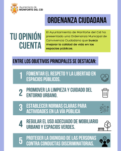 El pasado 7 de noviembre, el Pleno del Ayuntamiento de Monforte del Cid aprobó inicialmente la nueva Ordenanza Municipal de Convivencia Ciudadana. Esta iniciativa tiene como objetivo reforzar el respeto y el civismo en los espacios públicos del municipio, mejorando la calidad de vida de todos los vecinos y vecinas. Actualmente, la ordenanza se encuentra en exposición pública.
