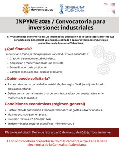 El Ayuntamiento de Monforte del Cid informa de la publicación de la convocatoria INPYME 2026 por parte de la Generalitat Valenciana, destinada a apoyar inversiones industriales productivas en la Comunitat Valenciana.
