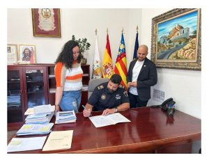 La firma que formalizó su ascenso se llevó a cabo en el despacho de alcaldía en presencia de Juan José Hernández, alcalde de Monforte del Cid, y la concejala de Seguridad, Mari Carmen Ramírez.