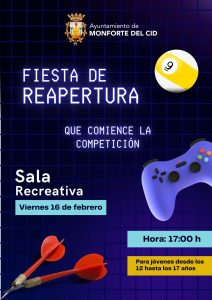 Este próximo viernes 16 de febrero, la Sala Recreativa de la Casa de la Juventud de Monforte del Cid, reabre sus puertas con una fiesta llena de competición y palomitas, que comenzará a las 17:00h.