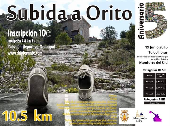 Este próximo domingo 19 de junio se celebrará la quinta edición del Cross Popular Subida a Orito. La salida será desde el Pabellón Municipal de Monforte del Cid a las 10:00 horas, y meta en la plaza del Convento de Orito. Por tercer año consecutivo la prueba presenta dos distancias, una de 4, 8 kilómetros y otra, para los más atrevidos, de 10, 5 kilómetros incluyendo la espectacular subida a la Cueva de San Pascual por la peña de piedra.
