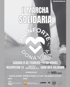 Monforte del Cid celebrará el próximo 8 de febrero la segunda edición de la Marcha Solidaria, que ha superado todas las expectativas con más de 1.100 inscripciones confirmadas. El evento sigue creciendo en participación, y aún quedan camisetas disponibles que pueden adquirirse en distintos puntos de venta.
