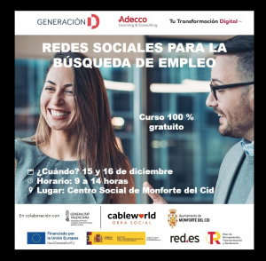 El primero de los cursos, “Redes sociales para la búsqueda de empleo”, se imparte los días 15 y 16 de diciembre, en horario de 9:00 a 14:00 horas. A través de esta formación, las personas participantes aprenden a utilizar las redes sociales como una herramienta clave para la mejora de su perfil profesional, el acceso a ofertas de empleo y la creación de redes de contacto laboral.