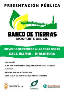 El Ayuntamiento de Monforte del Cid, en colaboración con TeleNatura y la Agencia de Dinamización Rural Buscatierras, presenta el Banco de Tierras, un innovador servicio de gestión del parcelario rústico destinado a la recuperación agraria, el relevo generacional y la promoción del emprendimiento en el sector agroalimentario.