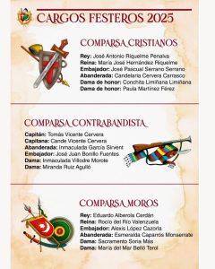 Como cada año, las tres comparsas —que este año desfilarán en el siguiente orden, rotando como es tradición: Cristianos, Contrabandistas y Moros— ya han designado a sus cargos festeros, quienes representarán con orgullo a sus respectivas agrupaciones durante todo el ciclo festero.