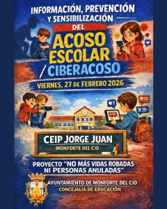 El Ayuntamiento de Monforte del Cid, a través de su Concejalía de Educación, pondrá en marcha el próximo viernes 27 de febrero unas jornadas de sensibilización contra el acoso escolar y el ciberacoso dirigidas al alumnado y profesorado de 5º y 6º de Educación Primaria del CEIP Jorge Juan.