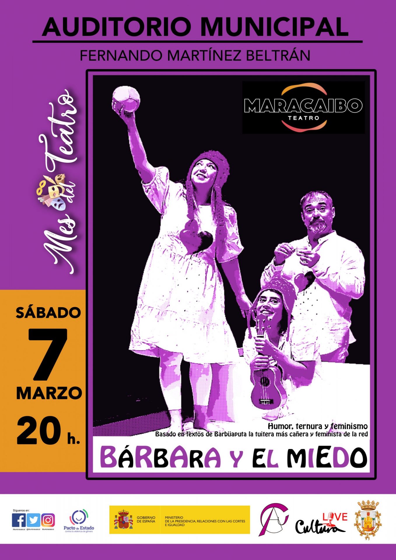 El día 7 de marzo de 2020, a las 20:00 h. en el Auditorio “Fernando Martínez Beltrán”, el grupo Maracaibo nos ofrecerá la representación teatral “Bárbara y el Miedo”, una obra realizada con mucho humor, teniendo como telón de fondo el rol femenino en la sociedad actual. Con esta representación, subvencionada por el Pacto de Estado contra la Violencia de Género, también pondremos el colofón a la Semana Cultural de la Mujer que todos los años organiza la Asociación de Amas de Casa, Consumidores y Usuarios, así como al Mes del Teatro organizado por la concejalía de Cultura. La entrada es libre y gratuita hasta completar el aforo.