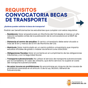 En esta nueva edición, correspondiente al curso 2024-2025, se mantiene el compromiso de apoyo a los y las estudiantes universitarias de Monforte del Cid. Este año se concederán 30 becas, con una dotación individual de 200 euros, lo que supone una asignación presupuestaria total de 6.000 euros.
