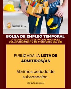 El Ayuntamiento de Monforte del Cid publica la lista de admitidos y no admitidos en la bolsa de empleo temporal de operarios/as de servicios múltiples, en la que se han presentado 149 personas.