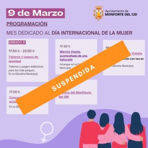 Ante las adversas condiciones climatológicas pronosticadas para este sábado 09 de marzo, la concejalía de Igualdad del Ayuntamiento ha tomado la decisión de suspender las actividades previstas para la jornada.