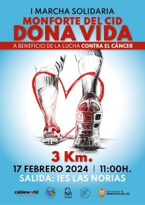 El municipio de Monforte del Cid se prepara para llevar a cabo su primera marcha solidaria, «Monforte del Cid Dona Vida». Este evento cuenta con la colaboración del CEIP Jorge Juan, el IES Las Norias, la Asociación Contra el Cáncer de Monforte, el Ayuntamiento de Monforte del Cid y Cableworld Obra Social, con el objetivo de recaudar fondos para la lucha contra el cáncer.